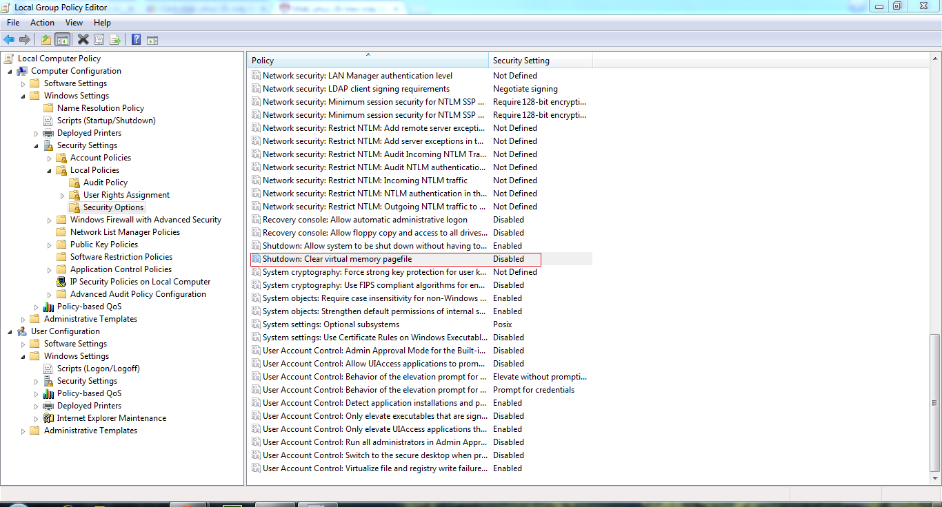 – Hộp thoại Local Group Policy Editor hiện ra, tìm đến mục Computer Configuration –> Windows Settings –> Security Settings –> Local Policies –> Security Options –> Shutdown: Clear virtual memory pagefile –> disable nó