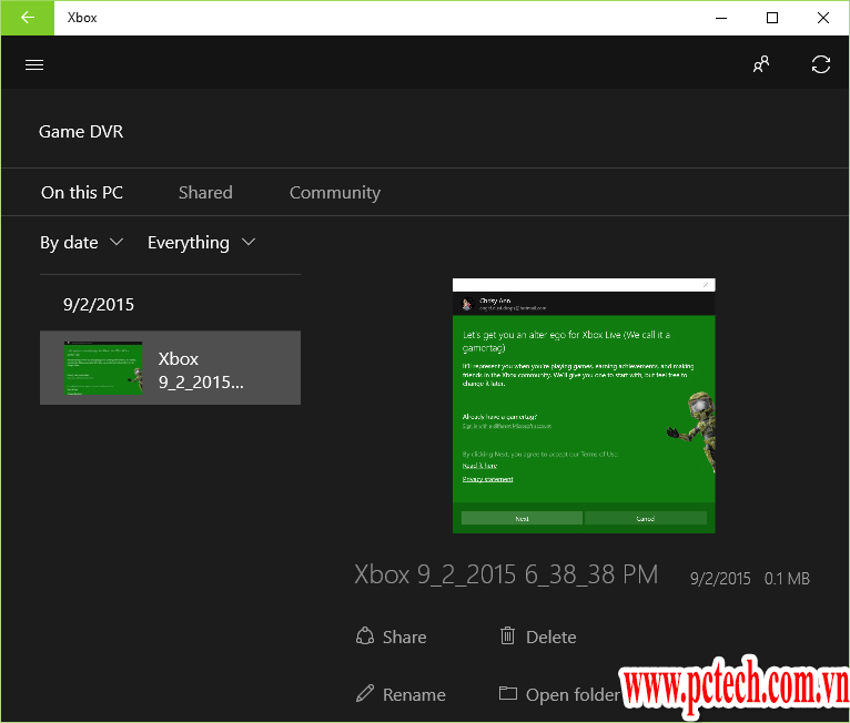 Bước 4: Khi ngừng quay, một thông báo sẽ xuất hiện thông báo cho bạn rằng video đã được ghi lại. Để xem lại video clip vừa quay, mở ứng dụng Xbox lên và truy cập vào biểu tượng Game DVR ở thanh menu. Tại đây, bạn sẽ thấy một danh sách tất cả các ảnh chụp screenshot và video được ghi hình nằm trong mục On this PC.