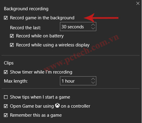 Nhấn tổ hợp phím Windows + G để kích hoạt Game Bar, sau đó nhấn vào nút Settingsđể mở menu cài đặt. Sau đó tích vào tuỳ chọn Record game in the background dưới mục Background recording. Ngoài ra, mục Record the last cho phép bạn thay đổi thời gian ghi âm.