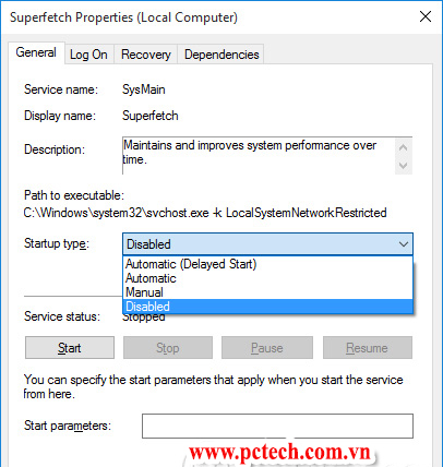 Nhấn chuột phải vào dịch vụ Superfetch và chọn Stop, sau đó vào Properties của dịch vụ đó và thay đổi thiết lập như hình dưới: