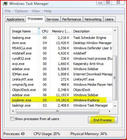 – Tiến trình Windows Task Manager khởi động, tại đây các bạn chọn tab Processes, tìm explorer.exe, nhấn chuột phải và End Process:
