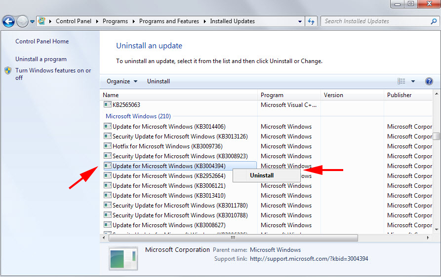 Tiếp theo, dựa vào phiên bản Windows mình đang dùng mà bạn hãy nhập vào ô tìm kiếm các từ khóa: 3035583, 2952664, 3021917 với Windows 7 và 3035583, 2976978 với Windows 8. Công việc tiếp theo là hãy nhấn chuột phải vào từng kết quả và chọn lệnh Uninstall để gỡ bỏ những cập nhật này. Khi cửa sổ yêu cầu khởi động lại Windows sau mỗi thao tác Uninstall, bạn hãy nhấn vào Restart Later.