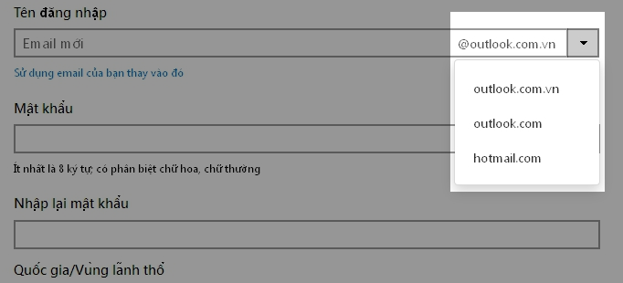 – Và chọn một loại email outlook hoặc hotmail bạn muốn đăng ký